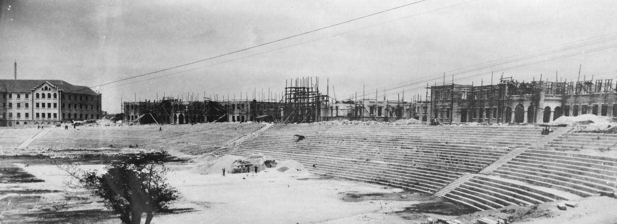 建筑前方的洼地被开辟成一个32200平方米的大运动场,并利用了地势落差把紧靠大楼的山坡砌出二十五级看台,可容纳观众两万人。虞愚先生为运动场命名并题写“上弦场”,故建南楼群又称上弦楼群。