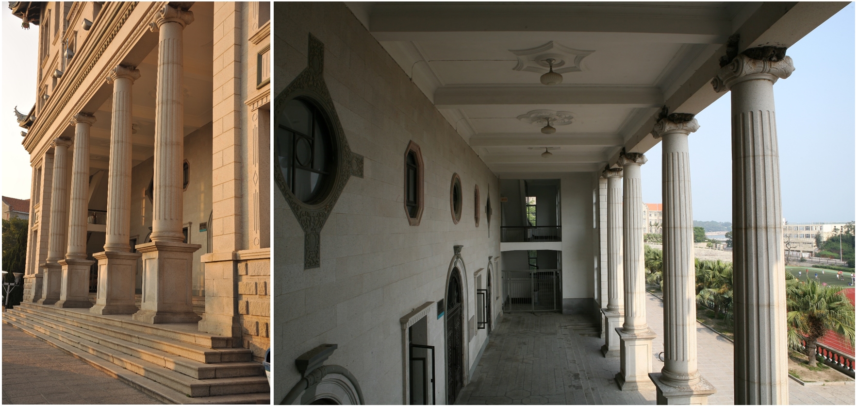 不拘泥于群贤建筑群传统中轴线的形式限制,建南楼群充分利用地形特点,沿山势呈“半月形弧状”围合排列。欧式花岗岩墙面、中式琉璃瓦歇山顶、两翼三层及相连的大露台两层、闽南古民居“飞檐翘脊”、门窗洞框的精雕细琢……五栋建筑像件件精美的艺术品错落有致地矗立在厦大校园里,中西艺术与文化的有机融合在其间展现得淋漓尽致,也折射出嘉庚先生“海纳百川、博采众长”的胸襟和观念。