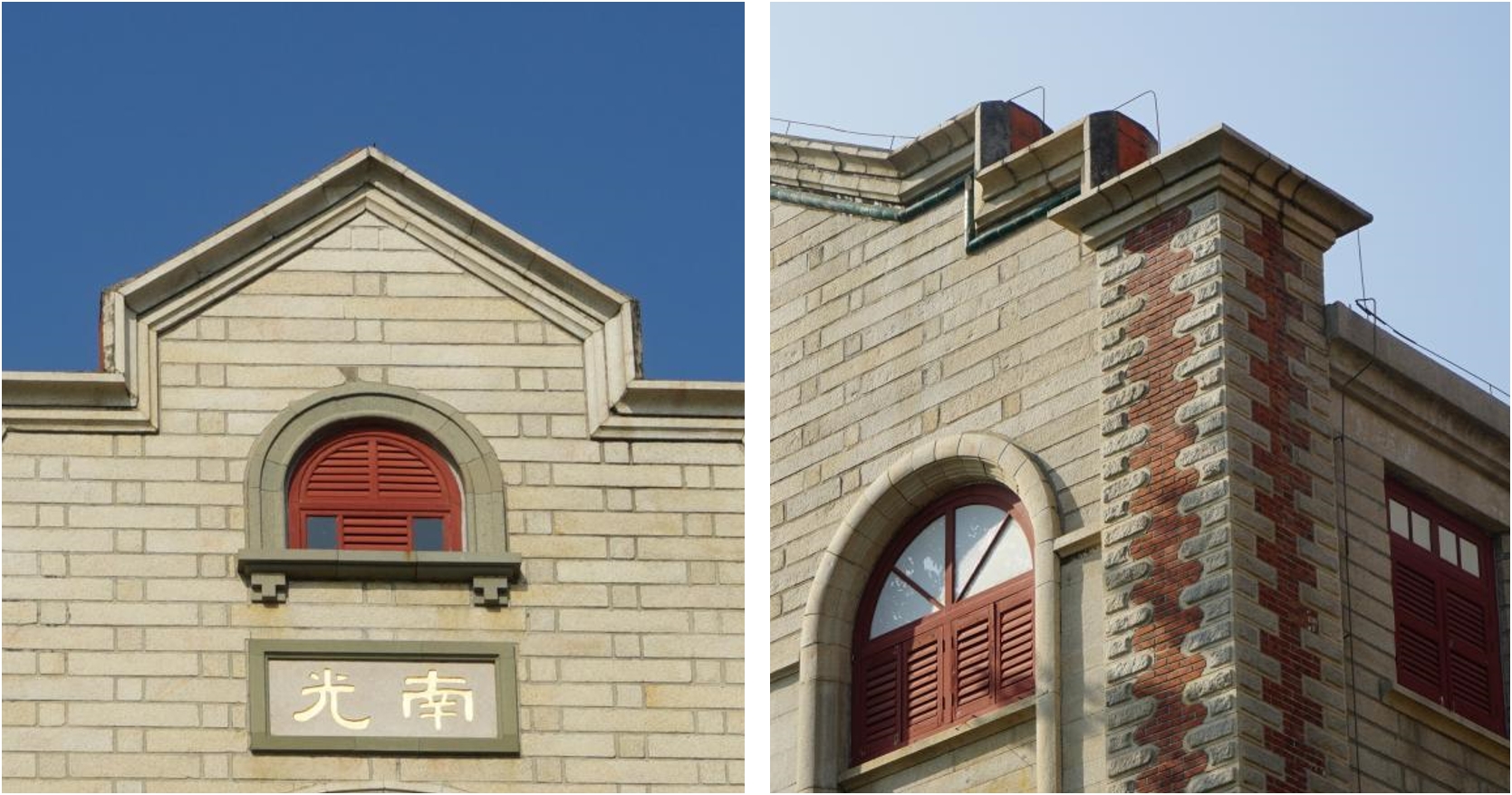 成义楼、南安楼、南光楼、成智楼4幢楼的结构和形制基本相同,均为3层石木混合结构建筑,平面呈内廊式布局,墙体为花岗岩条石砌筑,楼面为木结构上铺红色斗底砖。屋顶为双坡顶,面铺红色机平瓦。山墙开拱形窗,角柱作“出砖入石”装饰。