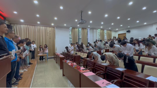 桃李不言,下自成蹊。师恩如雨,润物无声。老师作为学生成长的引路人和见证者,各支部将廉洁承诺书交由老师保管,不仅是青春的珍贵回忆,更在无形之中对学生形成督促和教育。为感恩老师们对教育事业做出的贡献和对关心下一代工作的辛勤付出,在座的同学全体起立,对老师们说“老师,您辛苦了!”。台上老师回应道,“同学们辛苦,为祖国做出更大的贡献!”彰显出双向奔赴的浓浓师生情。