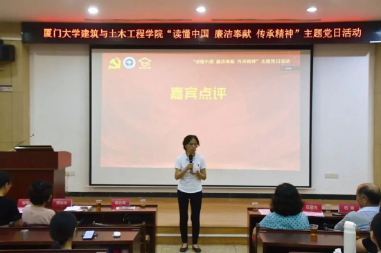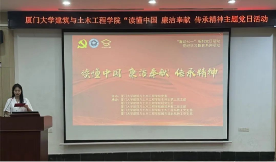 6月24日下午,厦门大学建筑与土木工程学院举办“读懂中国 廉洁奉献 传承精神”主题党日活动。该活动为学院“读懂中国”系列活动第七期,也是学院“榜样的力量”系列活动之一,由学院党委主办,学院博士、硕士、本科学生党支部及学院研究生会联合承办。