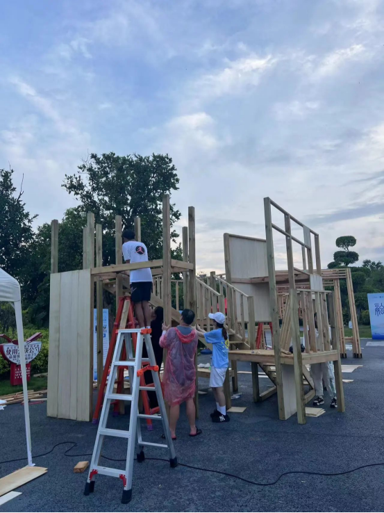 经过方案优化、选购材料、熟悉工具、预加工等准备后,团队于8月11日前往福州市马尾区琅岐红光湖公园展开为期三天的实体建造。面对紧迫的搭建期限和巨大的工作量,我校参赛团队制定合理的搭建计划,并根据现场施工的实际情况灵活调整策略,每一根木材、每一颗螺丝都被精心地安装到位,确保了建筑的稳固和美观。比赛期间当地受台风影响天气多变,老师与团队成员不畏烈日和风雨,同心协力,最终及时完成作品。队员李林茜表示,实体搭建比预想中存在更大困难,庞大沉重的构件、地势产生的高差以及恶劣的天气情况都是不小的挑战,所幸最终在团队成员的努力下,完整坚固的构筑物成功搭建。