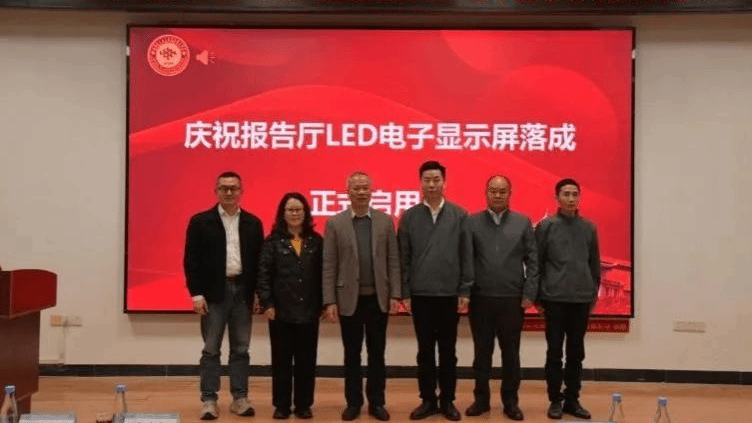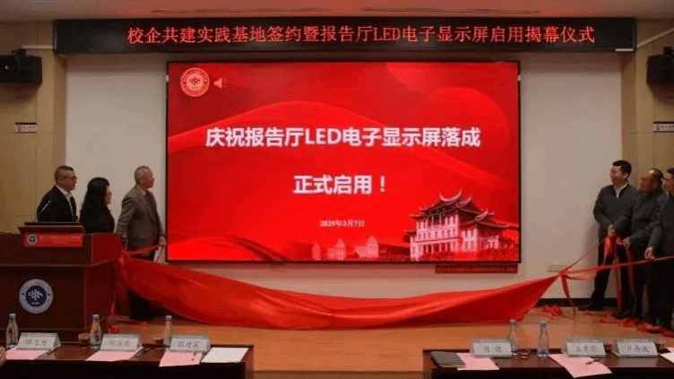 签约仪式后,校企双方共同为新捐赠的报告厅LED电子显示屏举行揭幕仪式。该显示屏将用于学术展示、实践教学及科研成果发布,成为学院智能化建设的重要窗口,进一步提升学院的教学和科研环境。