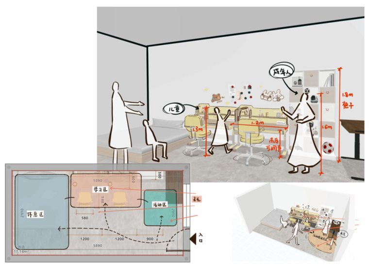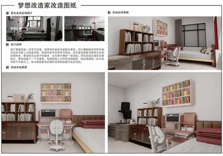 针对不同家庭的空间短板与儿童个性化需求,结合家居实际,项目团队充分运用专业知识,对拟改造空间进行细致测量与评估。设计中既注重功能性与舒适性,优化桌面高度适配青少年身形发育,采用环保耐用材料保障使用安全,融入收纳分区设计提升空间利用率;又兼顾人文关怀,部分方案增设采光优化、储物空间拓展等细节处理,让每一个学习角落都兼具温度与实用性。