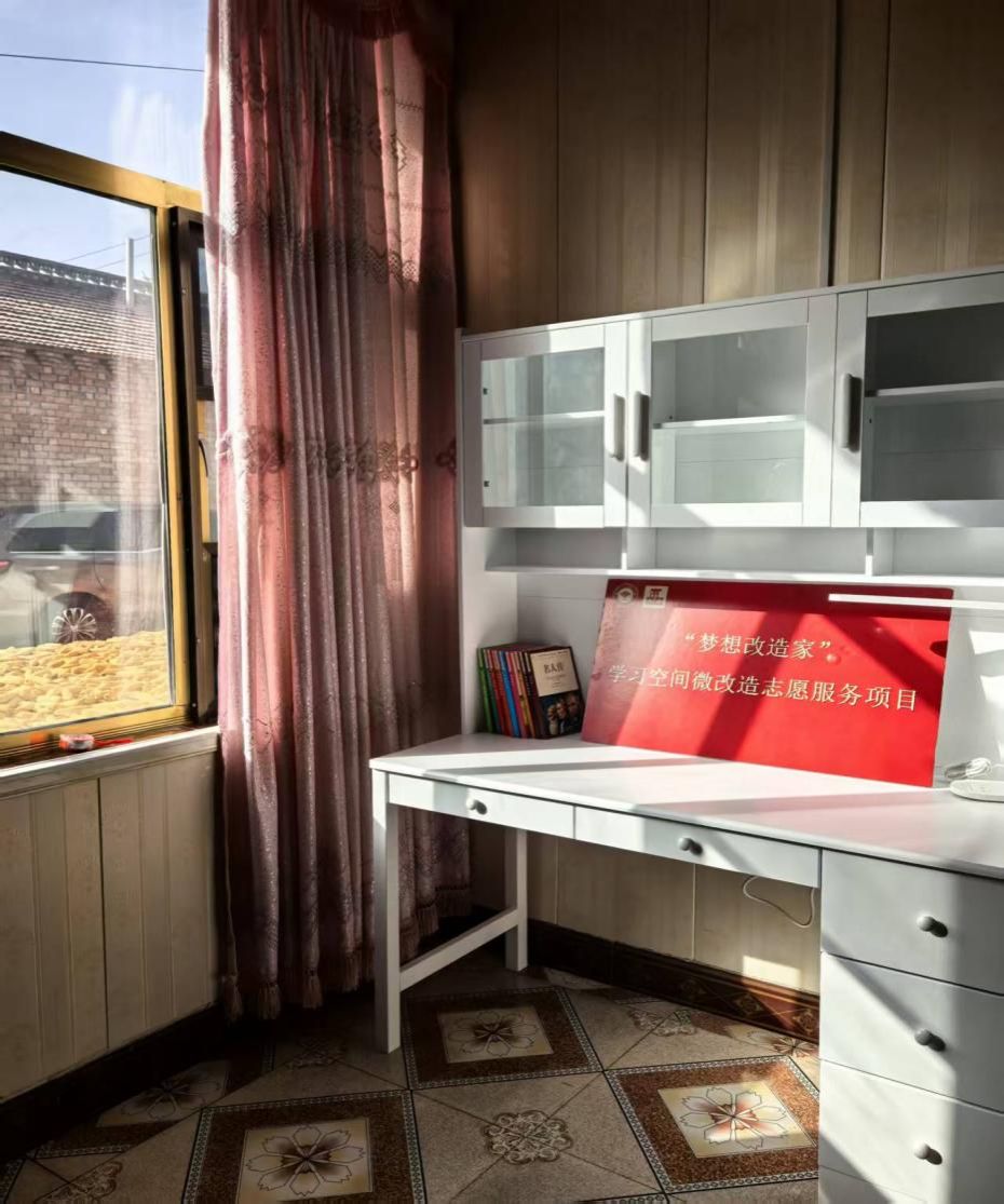 2026年1月,学院组织寒假专项社会实践队伍,跨越山海奔赴闽宁镇实地开展入户组装和布置,并送上儿童读物和学习、文体用品。在闽宁镇各村的农家小院里,志愿者们分工协作、配合默契,仔细拼接板材、反复调试桌椅高度、精心布置学习与收纳空间,以专业素养和务实行动将设计蓝图转化为触手可及的学习实景。1月15日,在多方通力协作下,首批 10 户困 难青少年家庭的专属学习空间全部改造完成并交付使用,原本简陋杂乱的角落摇身一变,成为宽敞明亮、功能齐全的“学习天地”。