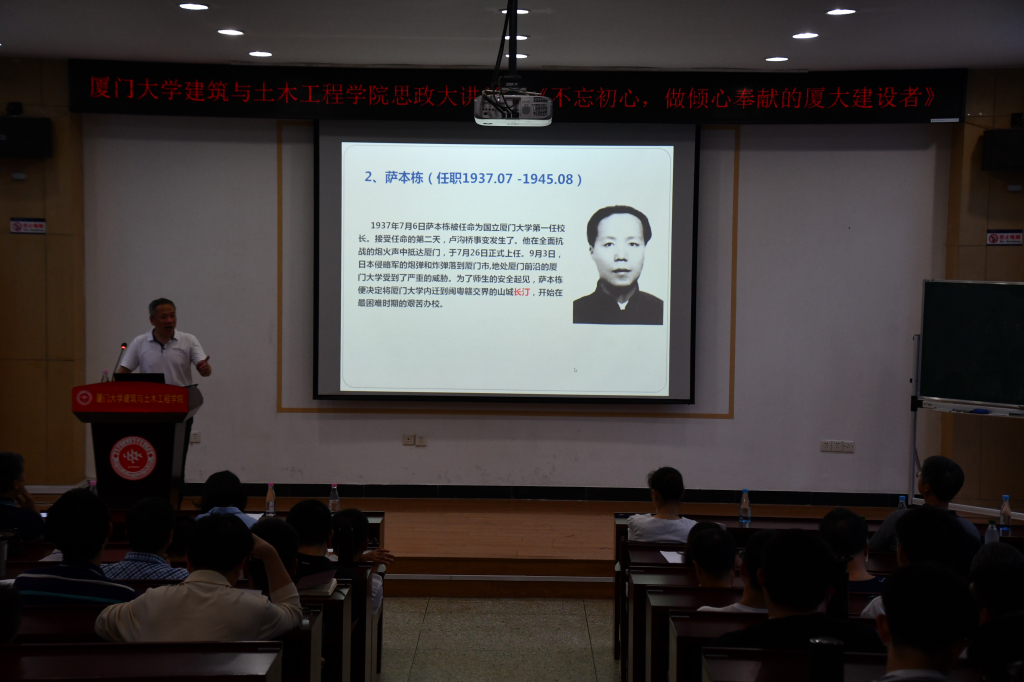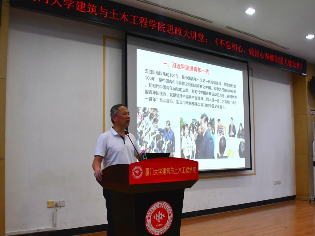 2019年5月22日下午,建筑与土木工程学院“我和我的祖国”系列活动暨思政大讲堂《不忘初心,做一个倾心奉献的厦大建设者》专题报告在曾呈奎楼118报告厅顺利举行。校长助理、校基建处处长张建霖教授,建筑与土木工程学院党委副书记王瑛慧、黄俊清,基建处副处长、党支部书记张晓芸,土木工程系主任古泉,系副主任、系教工党支部书记高婧,系副主任张建国,基建处、土木工程系全体老师,以及土木工程系2017、2018级的全体研究生参加此次活动。此次活动由土木工程系教工党支部、基建处教工党支部承办。