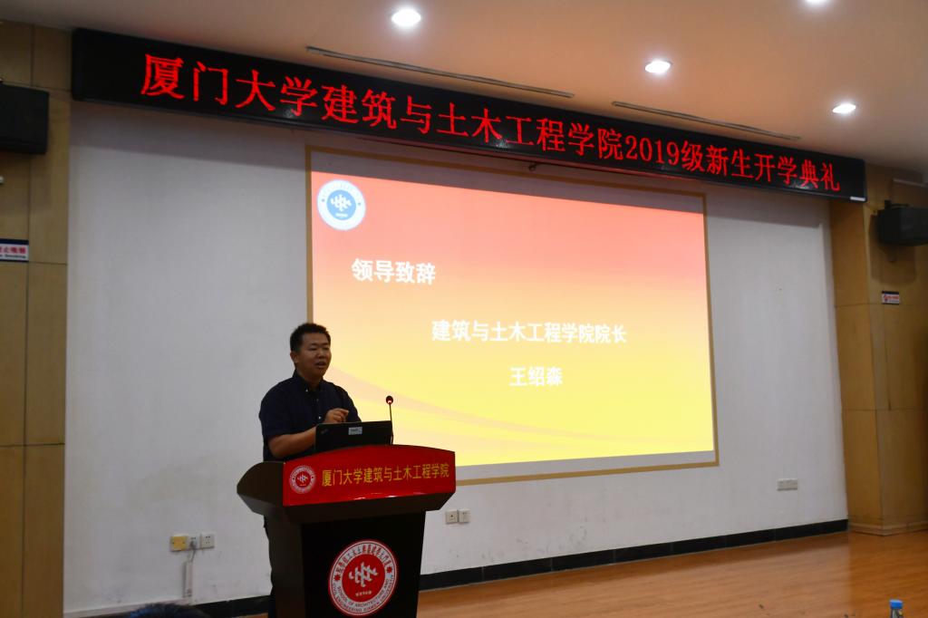 开学典礼首先由王绍森致辞,他代表学院向2019级新生表示衷心祝贺和热烈欢迎。随后,他从求学、生活等多个方面,教导同学要牢记自律自强,努力打好学科基础,及时明确国家责任,时刻遵守言行法则,主动加强身心锻炼。最后,院长祝愿每位学子未来都能学业有成,始终保持身心健康,努力成为国家栋梁。