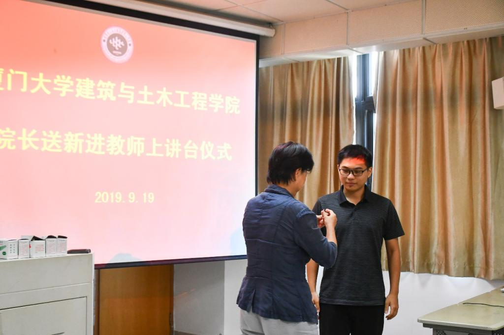 接着,党委书记刘梅为新进教师洪晓强佩戴校徽,并赠书《我的厦大老师》。