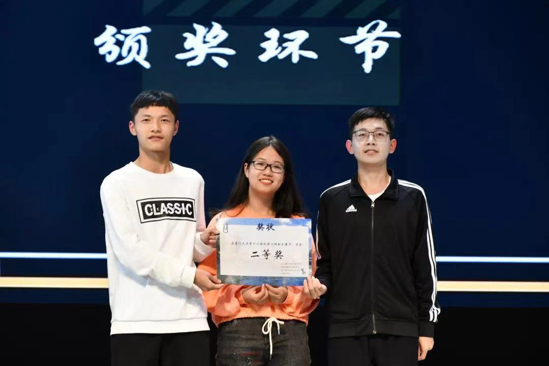 2019年12月8日晚19点,厦门大学第十二届心理剧决赛在思明校区建南大礼堂拉开帷幕,大赛旨在通过话剧表演的形式展现当代大学生在学习、生活上所遇到的心理困惑以及如何消除困惑,收获心灵自由的典型例子,呼吁在校大学生关注心理健康,正视问题,积极寻求解决的方法,树立正确的三观。经过初赛、复赛的层层选拔,共有九支队伍进入决赛。我院参赛队伍“银河互喂队6.0”位列其中,总分91.78的高分,在本次比赛中荣获二等奖。
