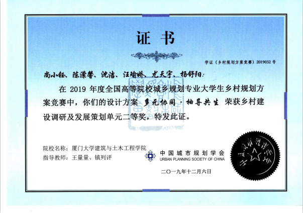 团队介绍:在目前的乡村振兴背景下,中国乡村类型据此分为四类,该团队选择“钟腾村”来代表集聚提升型乡村,希望通过规划设计和产业策划来为全国的同类型的集聚提升型乡村进行乡村振兴提供借鉴。在对实地进行深入调研的基础上,通过探讨钟腾村的发展根本性问题,以产业为切入点,提出乡村共生圈理论,通过构建乡村制度、产业、空间和人文四个层面之间的循环共生关系,来使得乡村形成有机整体,提升乡村共生力。产业策划上,突破以往传统的大而空的规划模式,以钟腾村产业问题这一根本痛点为中心,从钟腾实际的蜜柚产业出发来制定产业目标、确定产业发展定位以及多产融合发展的体系,并给出了完善且可行的制度创立方案、市场策略、保障措施、项目策划以及项目进度安排等分布落实的相关内容。在乡村规划年会中,该产业策划成果也得到了评委的“凝练了乡村真问题,发展策划逻辑清晰,可行度高”的好评,并作为优秀成果在年会上展出,最终,该方案获得2019年度全国高等院校大学生乡村规划方案竞赛决赛全国第二名、二等奖的优异成绩。