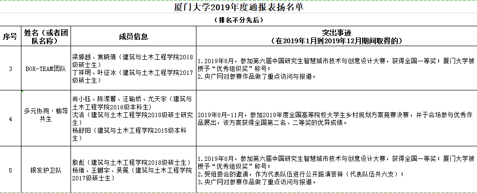 根据《厦门大学学生表彰奖励暂行规定》,学校决定给予以上三个团队通报表扬。在此次通报表扬中,全校共计9个团队、6名个人,我院占获奖团队总数的三分之一。突出的成绩离不开学院对于学生创新能力和科研精神的塑造与培养,离不开师生间不懈的努力和默契的配合,接下去,学院将采取多种方式,继续鼓励学院师生积极投身创新竞赛、学术研究,争取取得更加优异的成绩。希望同学们以他们为榜样,继承发扬优良学风,努力提高综合素质,为推动科学和社会的进步作出贡献。
