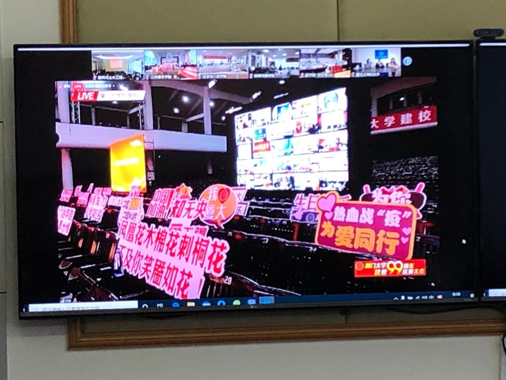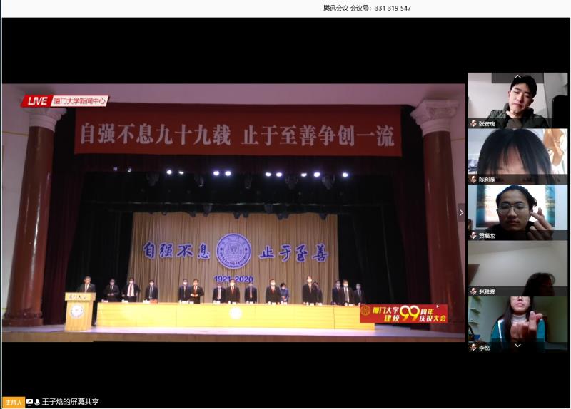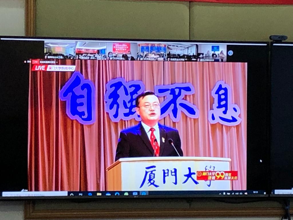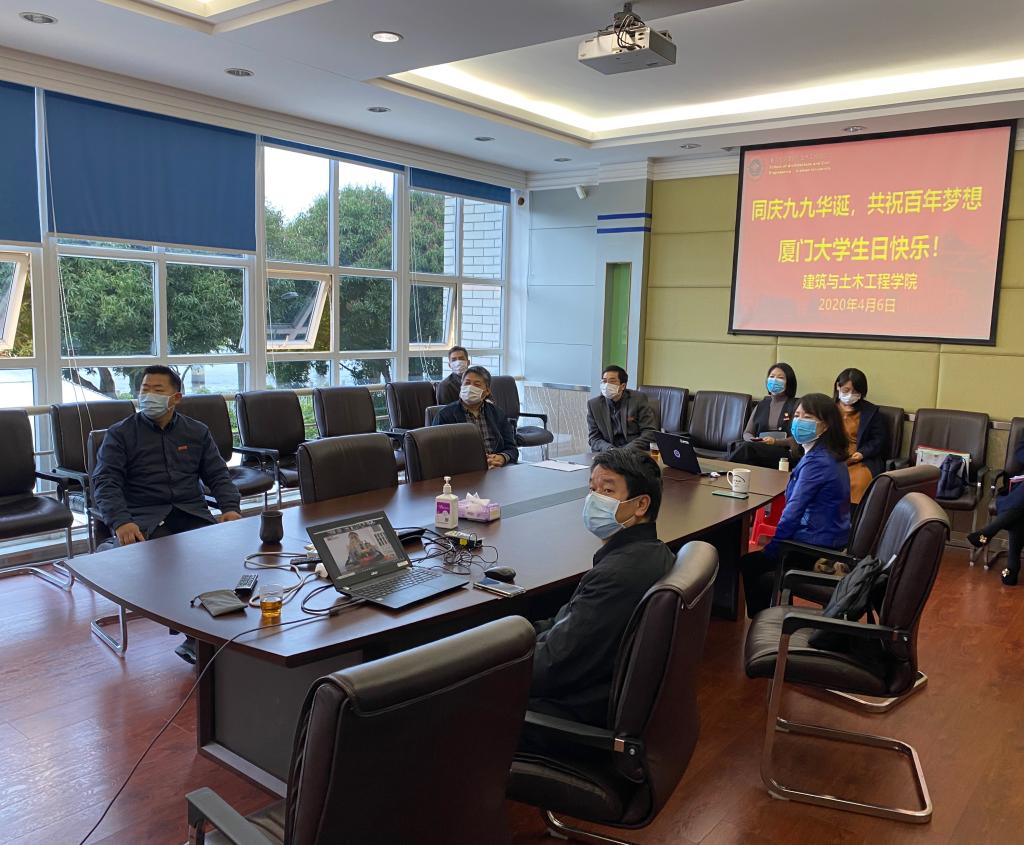 2020年4月6日上午,厦门大学建校99周年庆祝大会在建南大会堂隆重举行,校党委书记张彦、校长张荣等校领导,原校长、厦门大学校友总会理事长朱崇实等校级老领导,校党委常委、校长助理在建南大会堂主会场出席庆祝大会。校党委副书记、副校长李建发主持大会。此次大会通过网络直播的方式,并在全球校友会、校内各单位设400个网络分会场,邀请各地校友、学子、各界人士在云端相聚,共同为厦大庆生,在线收看直播人数突破100万人次。建筑与土木工程学院作为分会场,线上线下共计组织900余师生共同观看直播。