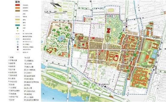 《漳州古城保护开发修建性详细规划》项目以“传承”为抓手,还原一座具有“闽南风、漳州味、宋河韵、老街情、慢生活”的漳州古城。规划将散落古城的历史温情种子(庙宇、牌坊、古民居、百年老店等)进行整合,释放公共空间,通过“金木水火土”的业态营造,活化古城,传承文化。规划以河流为核心带,把大自然的花、草、树、鸟等七彩原色根植在古城的各个角落,保障古城生态有机发展(图1)。项目主要完成人员有王绍森、李立新、杨佳麟、韩晓宇、唐洪流、张乐敏、张若曦、郑灵飞、杨哲、张健、韩峰、王东华、戴伟泉、李秀燕、黄友谊。