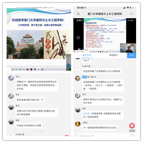 在互动环过中,学生们在线上先后就专业培养、课程教学、实习实践等方面提出了问题,活动在老师们耐心的互动答疑中落下帷幕。活动最后,李立新代表学院欢迎各位考生报考厦门大学建筑与土木工程学院,并祝愿每一位考生梦想成真。