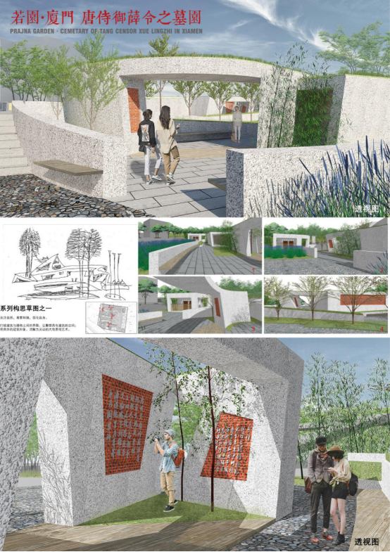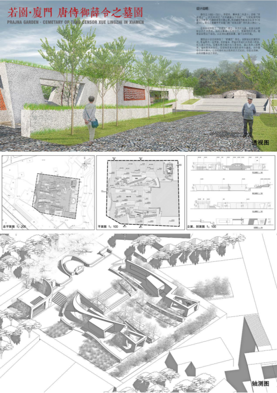 《若园·厦门、唐侍御薛令之墓园》项目以“弱建筑、若建筑”为理念。总体布局采用半地景,以此弱化建筑要素,融于自然,创造与自然结合的艺术景观,体现“弱建筑”的理念。设计语言则体现“若建筑”,将弧墙开洞或打开形成尺度多变,满足不同人群需求的多样空间。公厕和绿化也以弧形的方式组织,消解固化的建筑形式,创造出流畅、自然的建筑设计语言。(图1、2)项目主要完成人员有王绍森、陈宏、孙玲潇、徐一晴、雷雯。