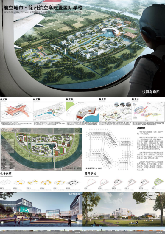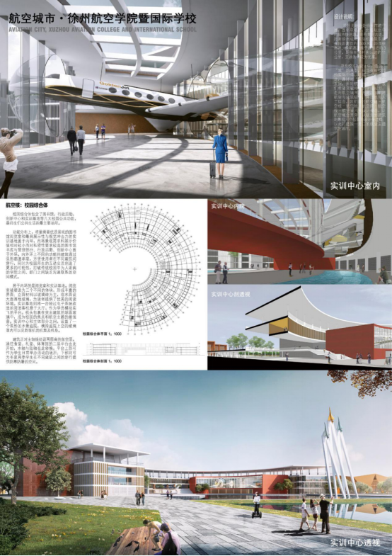 《航空城市·徐州航空学院暨国际学校》项目将“城”的主题与“航空”主题结合,突破传统学院规划,走向航空城市。项目包含三大部分:公园、国际学校和航空学院。公园沿基地南侧黄河古道布置,并向基地内部延伸,其中还设置地景式商业空间,满足周边市民和学校师生的生活消费需求。国际学校布置与基地西侧,主入口面向公园,与航空学院西门呼应。航空学院则从规划到建筑再到景观,在不同尺度上,分别以航空轴、航空核、航空舱、航空院、航空线、航空景6大概念,分别呼应航空主题。(图3、4)项目主要完成人员有王绍森、陈宏、孙玲潇、徐一晴、雷雯、戴建、王长庆、杨华刚。