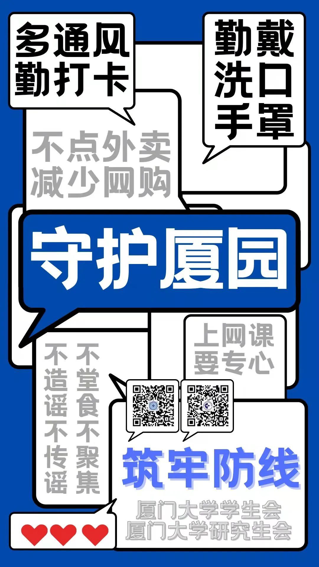 疫情防控关系到我们每一个人,只有携手同行,方能共克时艰!让我们一起站好位,尽好责,绷紧疫情防控这根弦,从自身做起,同时间赛跑、与疫情较量,为坚决打赢疫情防控歼灭战,贡献厦大学子的一份力量!请坚信,在党和政府的坚强领导下,在社会各界的共同努力下,春天不会黯然落幕,厦园必将再放异彩!