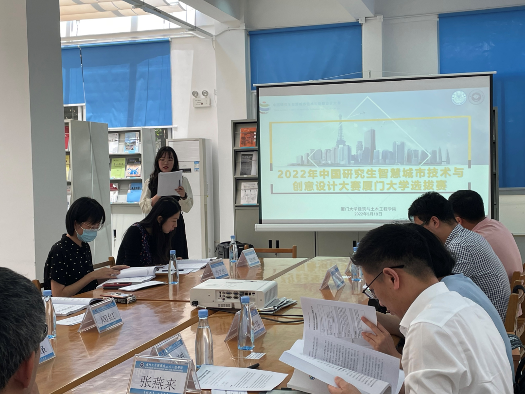 5月18日下午,第八届中国研究生智慧城市技术与创意设计大赛厦门大学校内选拔赛在建筑与土木工程学院举办。担任本次大赛的评委有建筑与土木工程学院副院长张燕来教授,建筑系主任石峰教授、副主任李渊教授,土木工程系周红教授,建筑系李芝也副教授、张乐敏助理教授、洪晓强助理教授,城市规划系邱鲤鲤工程师,集美大学计算机工程学院杨宝容讲师。出席大赛的嘉宾有校研究生院创新实践系列大赛负责人胡雄,建筑与土木工程学院党委副书记王瑛慧、团委副书记林婕、辅导员唐苗。2021级土木系硕士研究生王薇担任主持。