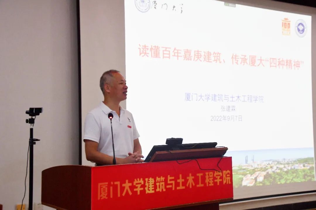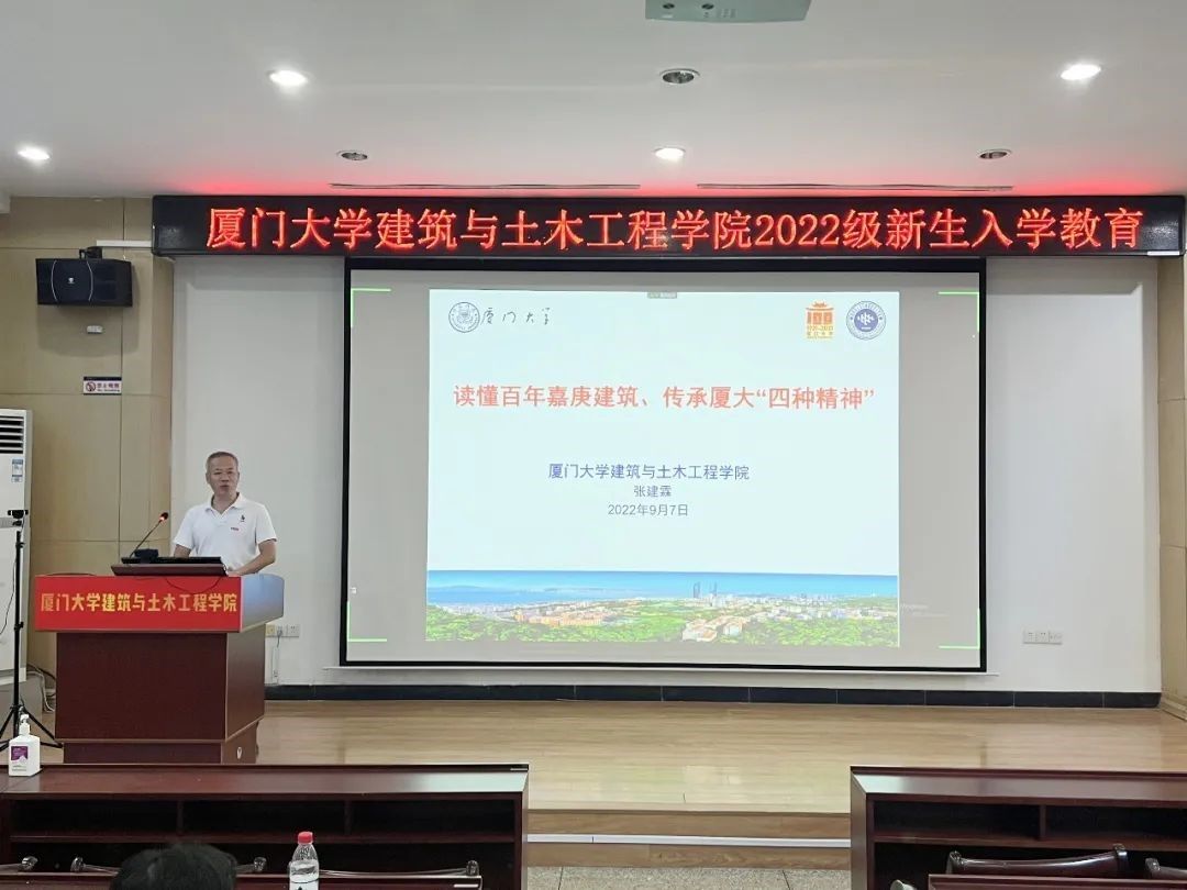 9月7日,建筑与土木工程学院2022级新生入学教育系列活动暨新生第一堂思政课在曾呈奎楼118报告厅举行。学院院长张建霖教授给2022级新生带来了题为《读懂百年嘉庚建筑,传承厦大“四种精神”》的专题讲座。讲座由学院党委副书记黄俊清主持,党务秘书郑建斌、辅导员赵晴晴及2022级全体新生参与了本次活动。