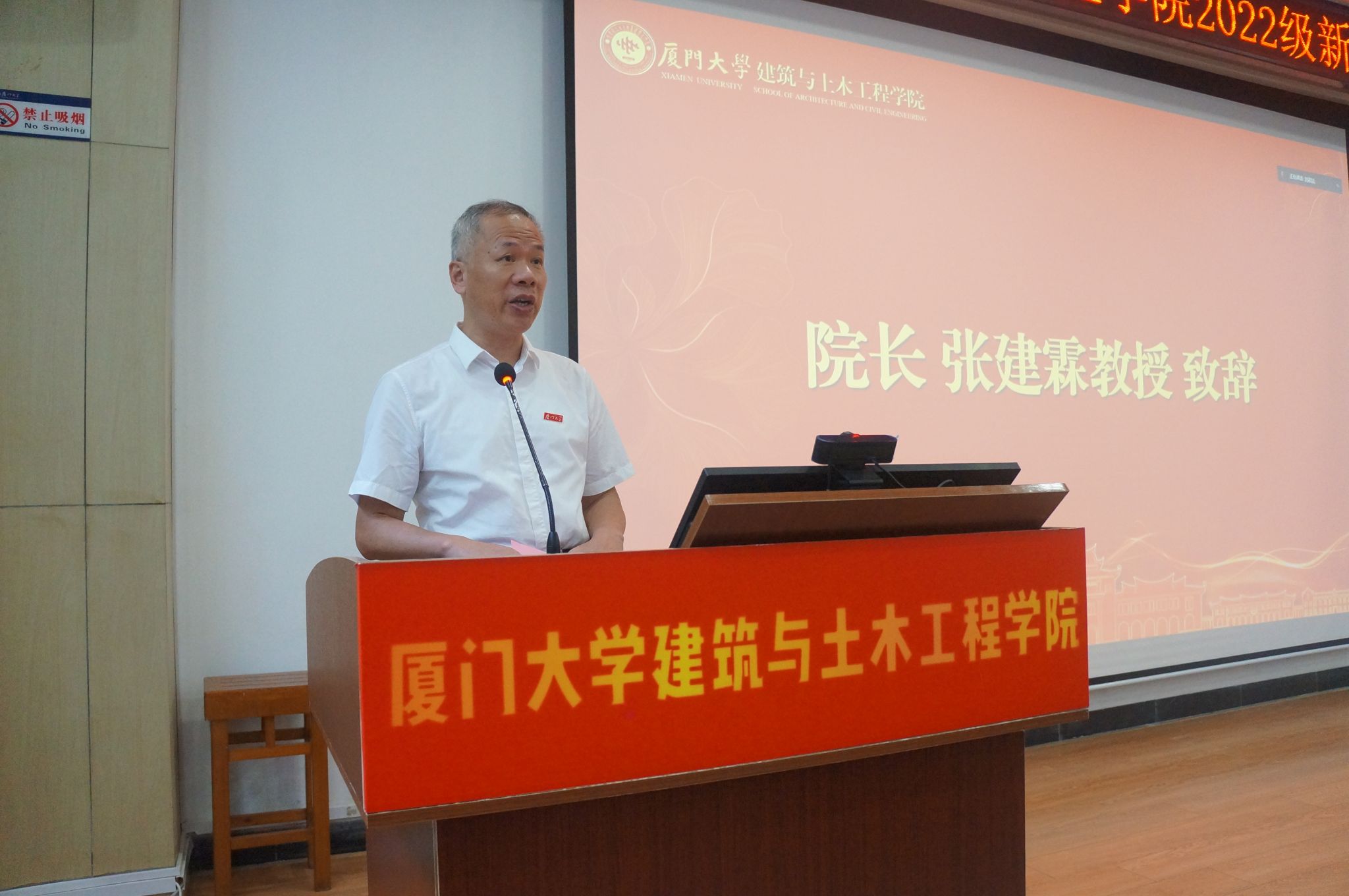 9月8日上午,建筑与土木工程学院2022级研究生新生开学典礼在曾呈奎楼118报告厅举行。出席本次活动的有院党委书记王绍森教授,院党委副书记、院长张建霖教授,院党委副书记黄俊清,副院长王东东教授、张燕来教授,学院各系领导,学工组全体成员,师生代表以及全体2022级研究生。本次活动由院党委副书记王瑛慧主持。