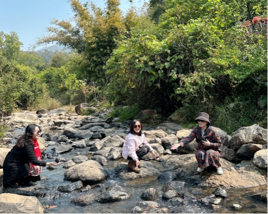 活动的第二站来到了鸳鸯溪谷。鸳鸯溪谷花草芬芳,空气清新馥郁,潺潺流水,星点碎石,老师们纷纷笑谈儿时的游水之趣。