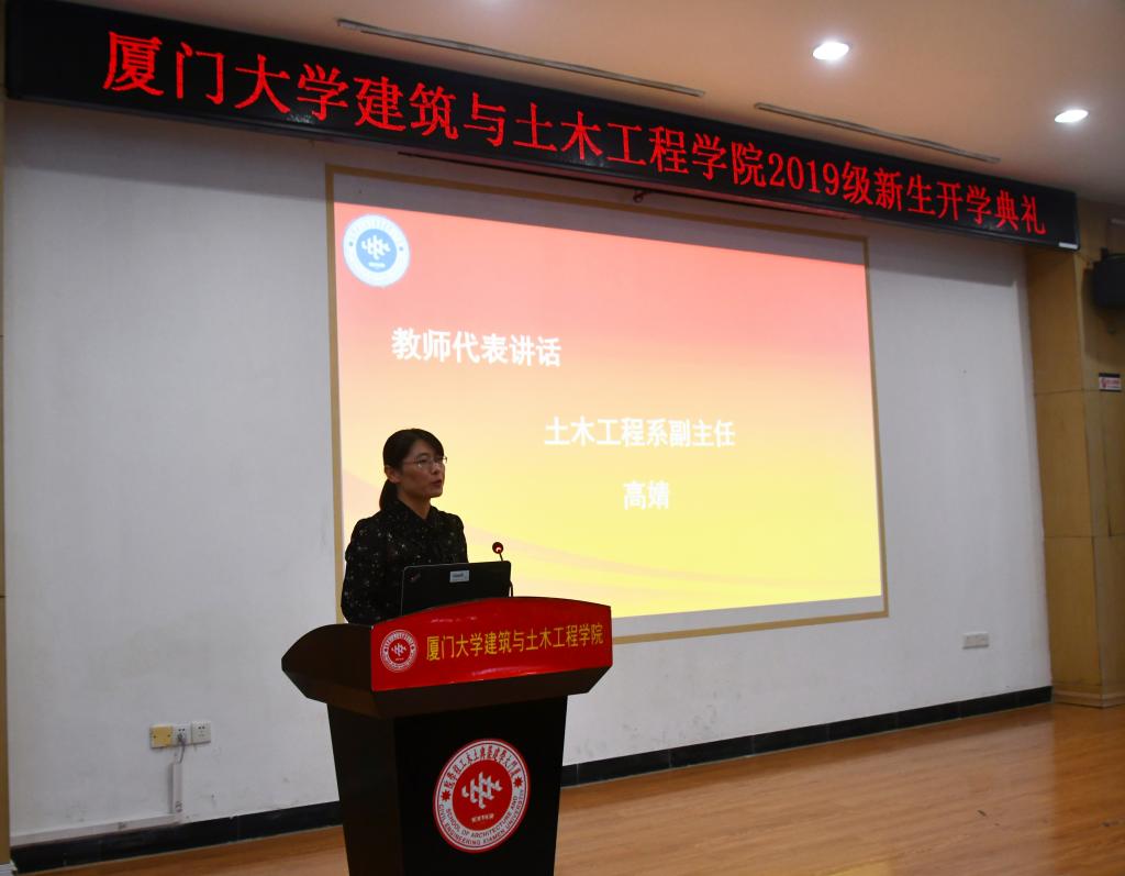 随后,新老师生代表发言先后进行。教师代表2019级本科土木工程班班主任高婧作为教师代表发言。发言中,她指出兴趣是最好的老师,每位同学需要寻求自身的兴趣点,作为今后人生发展的方向,持续学习,积极面对挑战,同时也要永怀感恩之心,在未来的学习和生活中收获更好的自己。