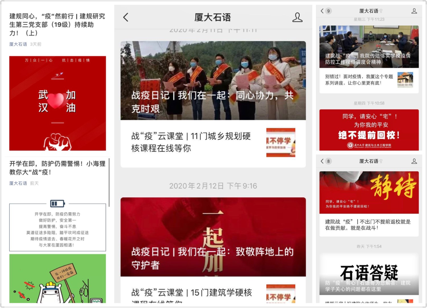 “战‘疫’第一线”栏目里,学生们分享着自己着对“各地医护人员争当逆行者”,“医护夫妻相遇不识”、“饭圈女孩驰援武汉”等话题的感想,2019级本科生林鹏写到“在大家都期待英雄与奇迹降临的时,是一个又一个普通人将自己的所能拼凑起来,然后才有了划破黑夜的光亮”;在“防有心线上答疑专栏,学生关心开学、上课、就业等问题都得到了及时回复;在“战‘疫’云课堂里,院长王绍森教授等人向学子们推荐了“15门建筑学硬核课程在线等你”,“11门城乡规划硬核课程在线等你”等学习资源,丰富了学生们的学习内容。