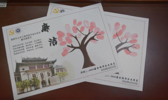 征途漫漫从头越,奋楫扬帆向未来。在2024届毕业生即将踏上新的人生征程之际,全体毕业生党员共同签下廉洁从业承诺书。毕业生党员代表来到台前,在“廉洁之树”上按下自己的手印表达同学们以嘉庚精神为指引,以廉洁之心,奉献自己的青春力量的决心。2024届毕业生党员邬纱纱、许烁钰、张锦鑫代表大家做出廉洁承诺,“绝不触碰腐败的红线,坚决杜绝贪污行为,保持廉洁自律。”
