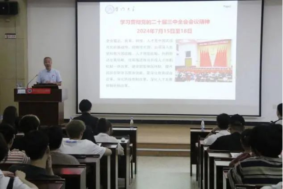 张建霖首先带领全体新生共同学习了党的二十届三中全会精神和习近平总书记在中国共产党第二十次全国代表大会上作报告的重要内容,并传达了厦门大学第十二次党代会精神。随后,他指出青年强则国家强,希望广大青年能够坚定不移听党话,跟党走,立志做有理想、敢担当、能吃苦的新时代好青年,让青春在全面建设社会主义现代化国家的火热实践中绽放绚丽之花。