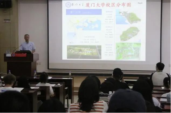 随后,他简要地介绍了厦门大学四个校区的发展情况和建设历程,通过解读陈嘉庚先生的亲笔信,向新生阐述了嘉庚建筑理念的产生与风格的形成。他从专业视角出发,通过介绍校区的整体规划、建筑构造、设计特色等方面,引领新生感受厦门大学建筑的独特魅力,同时也让他们充分了解设计者在建筑设计中付出的心血和巧思,真切体会到建筑从设计图纸走向现实的心路历程。