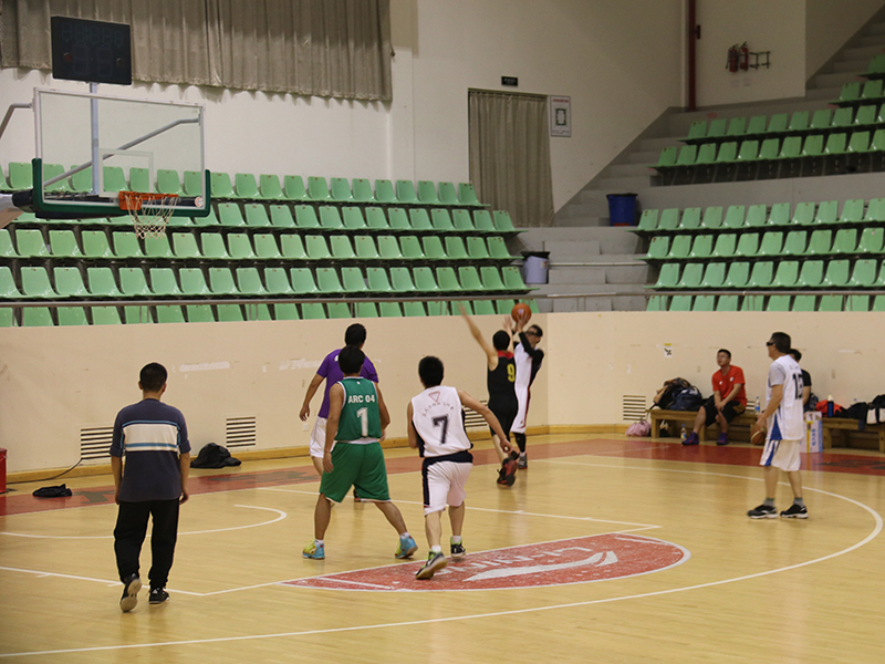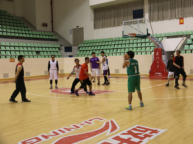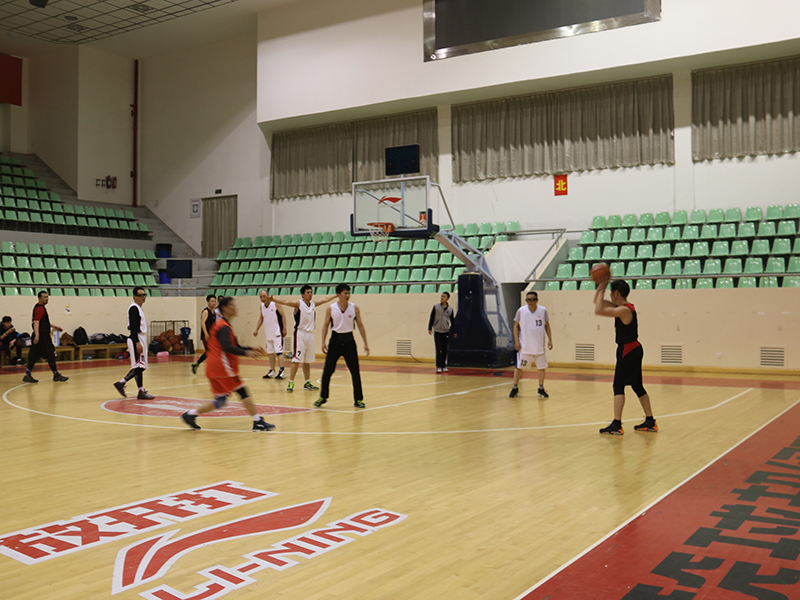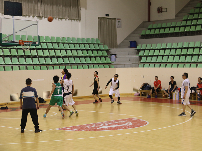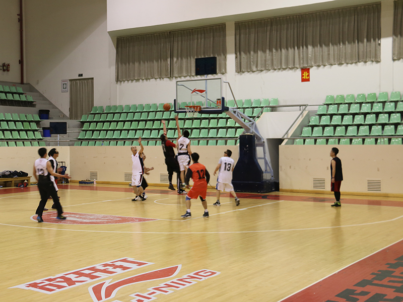 随着主裁判的一身哨响,篮球赛正式开始,校友队先拔头筹,获得了四比零的良好开局,磨合后的建院教工队随后开始反扑,此后比赛异常激烈,两队你来我往,比分交替上升。给人留下最深印象的是双方后卫的三分对飚战,几乎是前一秒教工队欢庆得分,后一秒校友队三分应声入网,比赛在双方替补席及观众席此起彼伏的欢呼声中焦灼进行。半场结束时,教工队32:29校友队,以3分的微弱优势领先。