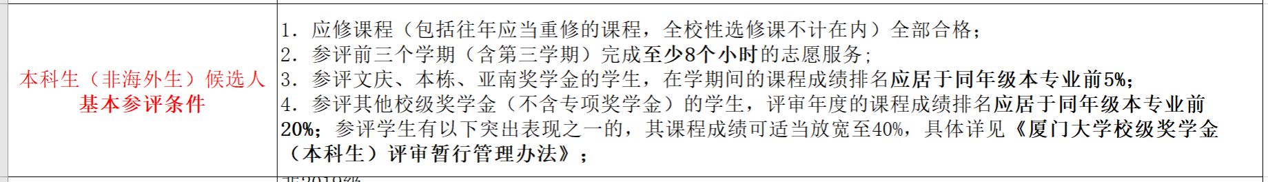 上述只是申请奖学金的基本条件,参评同学还需满足附件11(关于建筑与土木工程学院本科生校级奖学金评审实施细则的补充规定(试行))、附件12(厦门大学校级奖学金(本科生)评审暂行管理办法(厦大学〔2011〕42号))的相关要求。