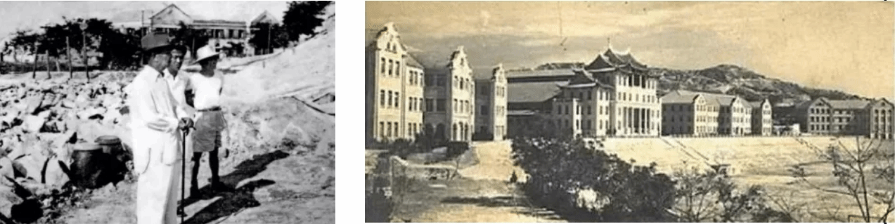 1951年陈嘉庚巡视建南楼群工地(左)建南楼群(1956年)(右)