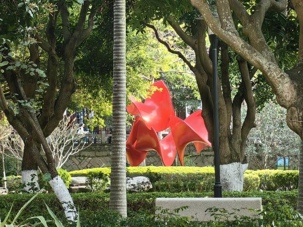 芙蓉湖畔,名为“青春”的红色雕塑,由多块曲面红色板片交织,是厦大校园里难得的彩色雕塑,进一步展现出青春活力的主题,不禁使人驻足。