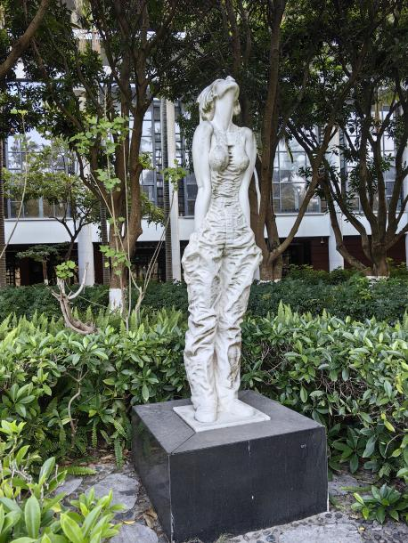 位于厦门大学艺术学院旁的树林里,孤寂而恬静地矗立着一尊孔子雕像。这座雕像是对中国古代哲学家、教育家孔子的一份敬意,也是这片树林的一处文化符号。孔子雕像栩栩如生,神情庄重而深邃,仿佛在沉思着千年来的人生智慧。他的头顶被一圈圈虬髯环绕,细腻的衣纹仿佛在微风中轻舞,似乎在述说着历史的沉淀与智慧的传承。