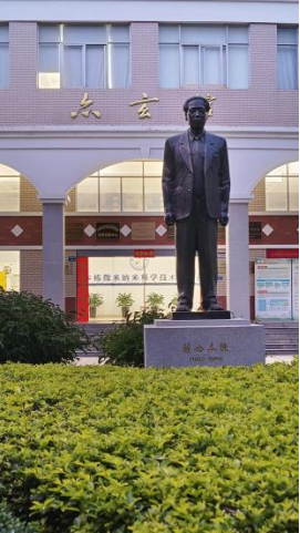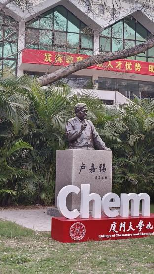 在化学楼门口,一左一右分别立有卢嘉锡先生与蔡启瑞先生雕像。