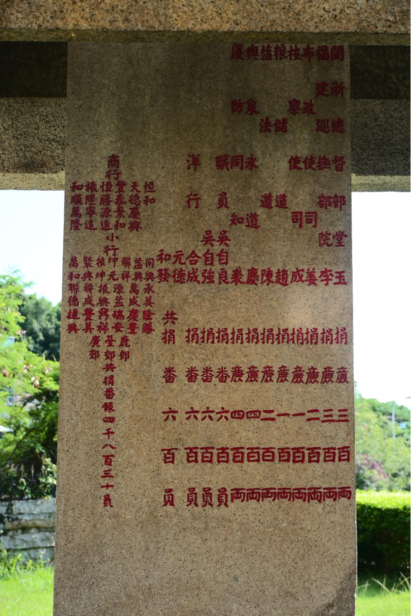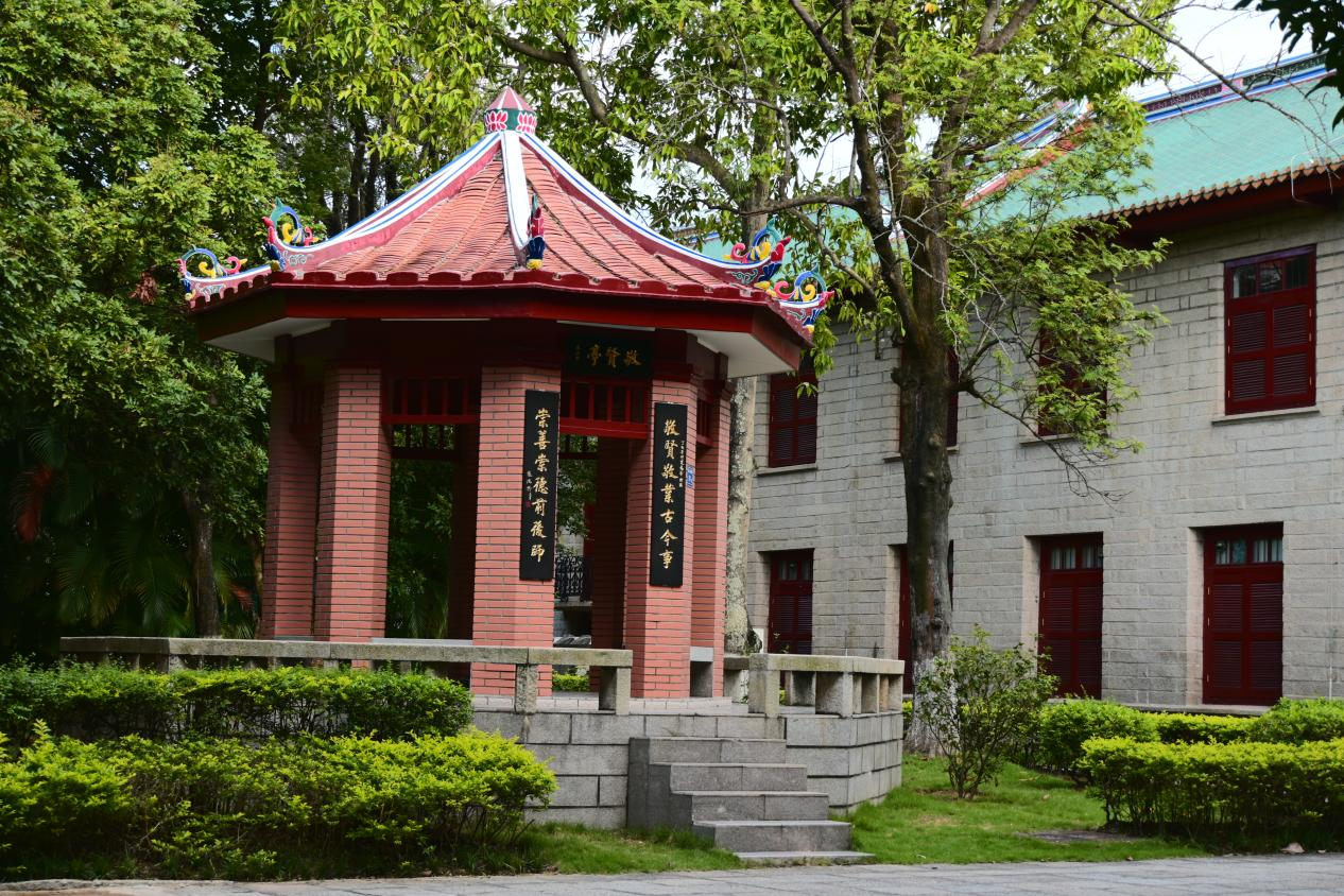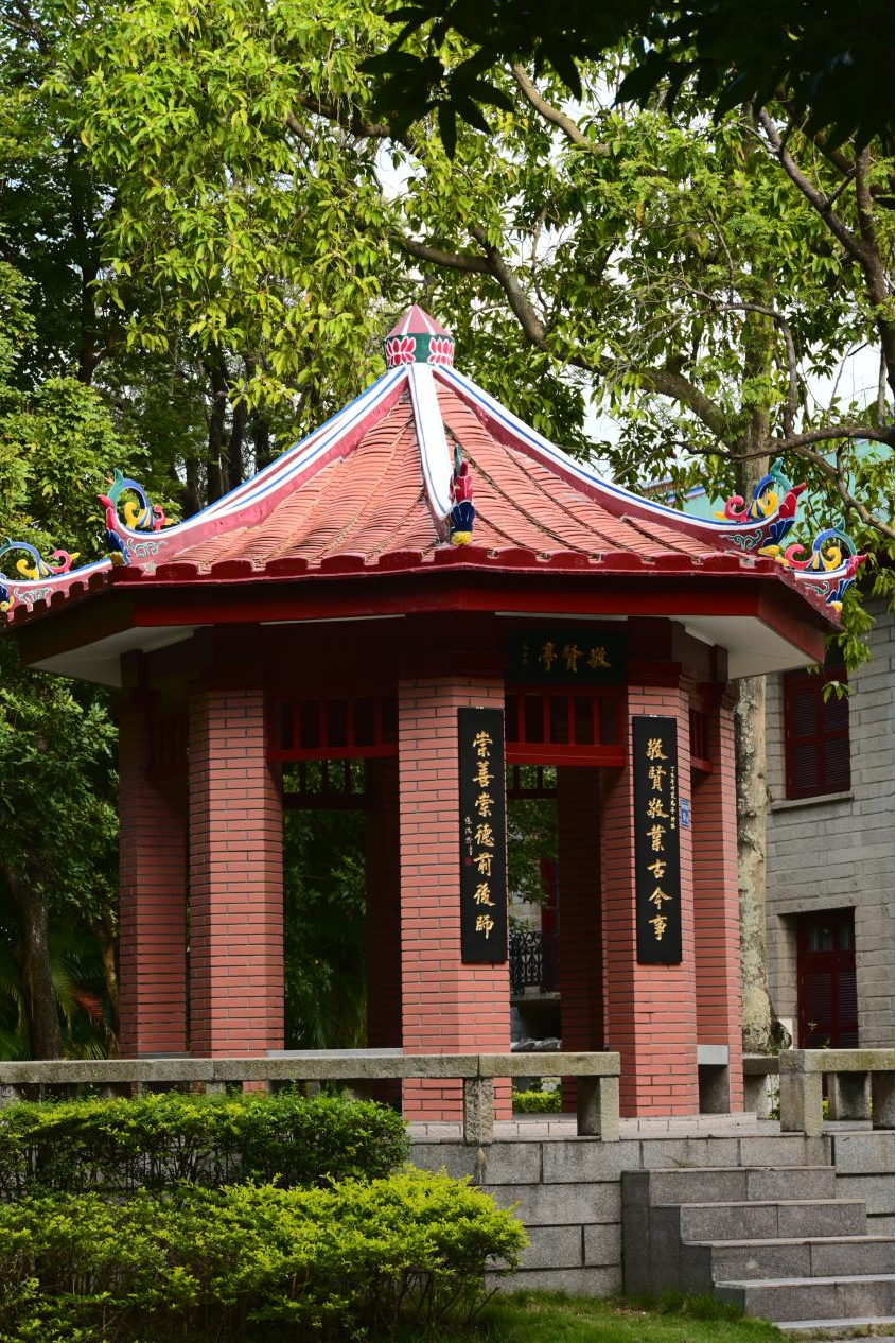 在建筑形制上,同样是“穿西装、戴斗笠”的整体风格,但敬贤亭与文庆亭又有所不同。此亭为八角攒尖亭,作为“斗笠”的亭盖部分中国传统建筑风味更为浓郁,采用了重檐翘角,作水戗发戗式样,戗脊与屋角都绘以艳丽的青红色,生机勃勃,富有闽南传统建筑色彩。亭身部分也不同于文庆亭,不设拱券而是做成了砖砌柱,用以支撑亭盖。敬贤亭整体风格方正而又不失俏皮,座落在单层台基上,经由几步台阶就可以抵达,周围绿树环绕、书声琅琅、颇为秀美,吸引了不少老师、同学、游客驻足停留。