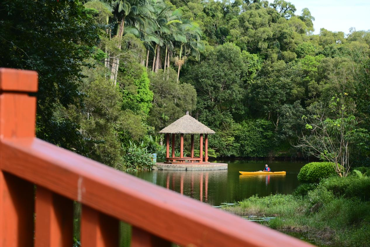 在亭子不远处,更是有一座与亭子采用同样色彩且木构而成的小桥,红桥卧波、亭立湖上,在厦门大学过去的漫长时光里,不知有多少老老少少、男男女女从桥上走过,在亭子里休憩赏景,享受着厦园里这幅仙境般的难得景色。
