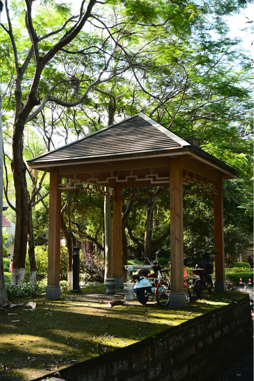 此亭位于建南楼背面坡下,立于一处台地之上、石板路岛旁,周围绿树成荫、苔藓遍地,在厦门炎热的夏天是一处难得的乘凉之所。此亭为四角方形木亭,不设瓦片而是使用了条木堆积形成亭盖,衡量处别出心裁地装饰有传统风格的折线装饰,整体给人以轻盈、通透的感觉。