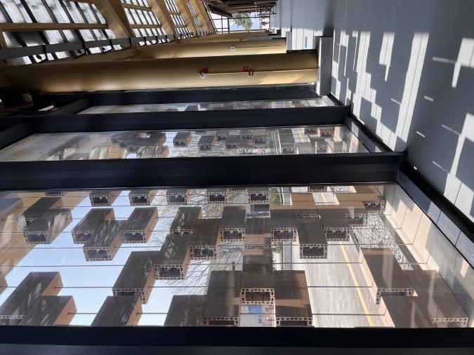 在原建筑结构外部新建类似“橱窗”的表皮,并采用模数化设计:其中立面陶砖有两种模数尺寸,分别为480×240×150和1035×240×150,以像素化搭接方式做出立面渐变的肌理;屋面玻璃采用300×600的彩釉玻璃,同样通过像素化拼贴方式做出屋面渐变的肌理。总的来说,新增的结构体系均采用工厂预制,现场安装,并且利用木纹肌理来体现“铁胁木壳”的意向,展现现代工艺的精致。