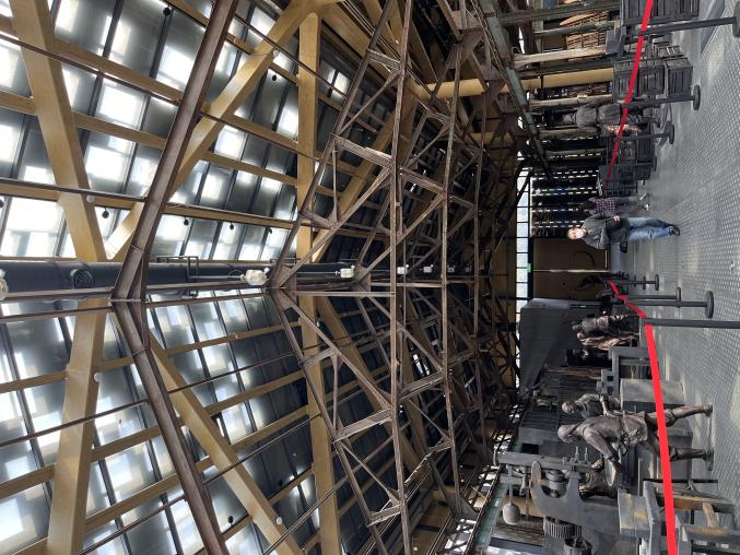 铁胁厂原结构钢材生产于约120年前,具有很高的文物价值,将原铁胁厂的主要构件以“展品”的形式进行保存。对于锈蚀较轻的钢结构构件,采用表面清理再喷涂透明阻锈剂的方式进行处理,最大化的展示原有构件的历史记忆。对锈蚀严重的钢柱,采用贴焊钢板的方式进行加固,焊接完成后,柱脚位置进行混凝土外包,其他位置采用外刷透明阻锈剂进行处理。同时对于原有钢构件上遗留的不同时期工业生产的附属构件如电风扇、吊车、设备管道等均最大程度地保留下来,以展示船厂时期工业生产的印记。还用雕塑还原了工人们在自制铁胁和飞机装配车间的场景,展示了船政从木船向铁胁跃进、从造舰向航空跃进的历程,显示了船政人与时俱进、紧追科技新潮的精神。