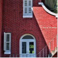 外墙采用红砖砌筑,质感厚重且富有地域特色,而窗框、门楣、立柱等细部采用白色,与红砖墙面形成色彩对比,增强建筑的层次感,使其更具立体感。