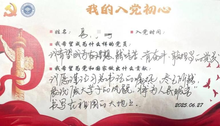 “我来自甘肃舟曲,在家乡发生特大泥石流后,百姓流离失所,孩子们无学可上,陷入绝望之时,各地党员们伸出了援助之手,给舟曲县的人民带来了生的希望”。2025年新发展的预备党员道杰才让,分享着他入党初心。从草原深处到厦大校园,从递交入党申请书到成为预备党员,在身边优秀榜样的指引下,他的思想不断受到洗礼,最终光荣地成为党组织的一员。
