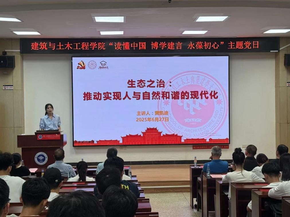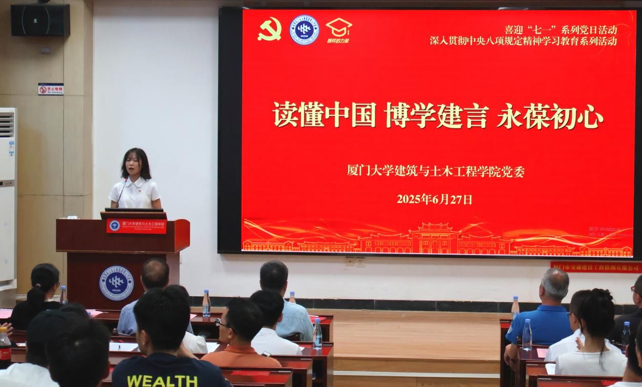 为迎接中国共产党成立104周年,6月27日下午,厦门大学建筑与土木工程学院举办“读懂中国、博学建言、永葆初心”主题党日活动。该活动是学院“读懂中国”系列活动的第八期,也是“榜样的力量”系列活动之一。出席活动的嘉宾有校基层党建联络员邱七星,学院关工委常务副主任陈和祥,学院党委副书记、院长张建霖,学院党委副书记刘建敏、邹海燕,厦门大学扬才班学员代表,学院各党支部、团支部的老师同学。本次活动由2024级土木工程系硕士研究生范思盈主持。