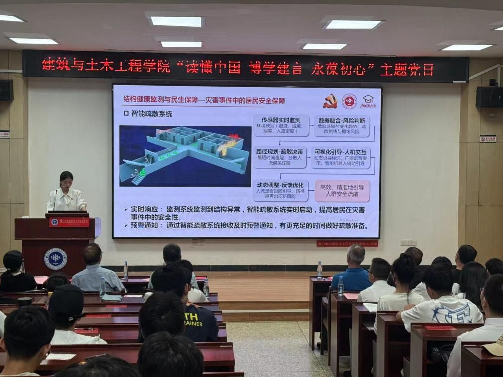 向春燕以“结构健康监测:筑牢民生安全底线”为题开讲,通过“做CT”的比喻,形象地解释了如何为结构做“体检”。她通过解析地震预警、智能疏散等技术如何为古建筑保护、交通基建织密安全网,向大家阐明了结构健康监测为何是以科技之力守护共同富裕的重要民生措施。