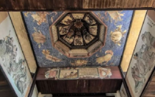 建筑前庭、后厅两边有数列对称厢房,每处厢房都有突出高耸的凉亭、 藻井。藻井作为中国传统建筑室内装饰的经典元素,在锦绶堂内得到精妙运用与传承,并且产生了精美华丽的视觉效果,其顶部以及四周均绘制彩画,如八仙过海、麻姑献寿、唐僧取经等神仙图案。厢房天花板亦饰以精美纹样,与藻井彩画相互辉映,共同展现出传统建筑装饰艺术的非凡造诣,堪称中国古代建筑美学的生动诠释。