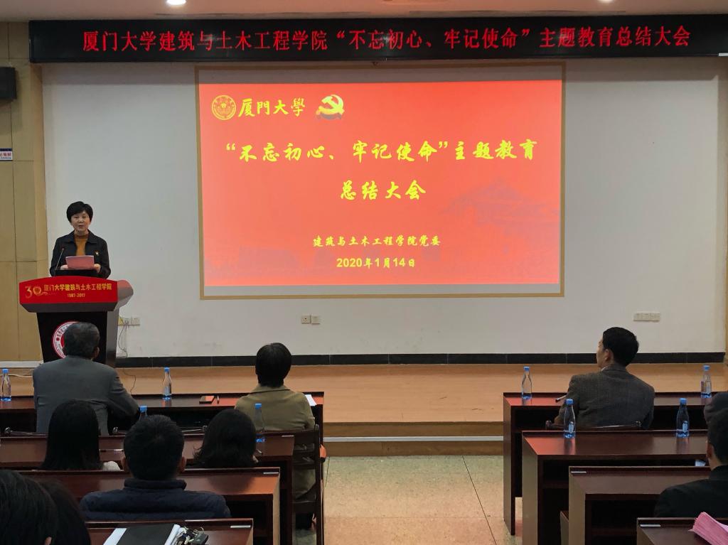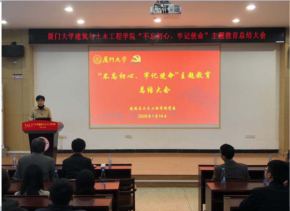 1月14日下午,厦门大学建筑与土木工程学院“不忘初心、牢记使命”主题教育总结大会在曾呈奎楼118报告厅召开。校第二巡回指导组副组长、校宣传部副部长楼红英出席并讲话。院党委书记刘梅作总结讲话。学院全体党委委员、学院行政领导,校基层党建联络员黄定基,工青妇负责人,学工组全体成员,全体党支部书记、支委,师生党员代表参加了会议。院党委副书记、院长王绍森主持会议。