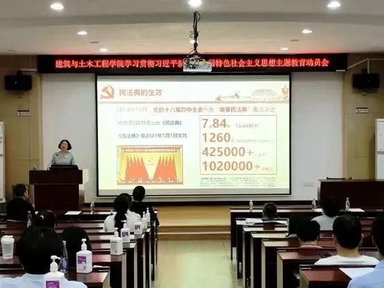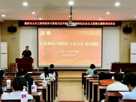 4月19日下午,建筑与土木工程学院学习贯彻习近平新时代中国特色社会主义思想主题教育系列报告在曾呈奎楼118报告厅举行。厦门大学法学院教授、厦门大学学报(哲社版)编辑部主任何丽新作题为《<民法典>的中国特色 人本主义 亮点制度》的专题报告。建筑与土木工程学院全体党委委员、师生党支部书记、全院教师参加本次会议。会议由学院党委副书记黄俊清主持。