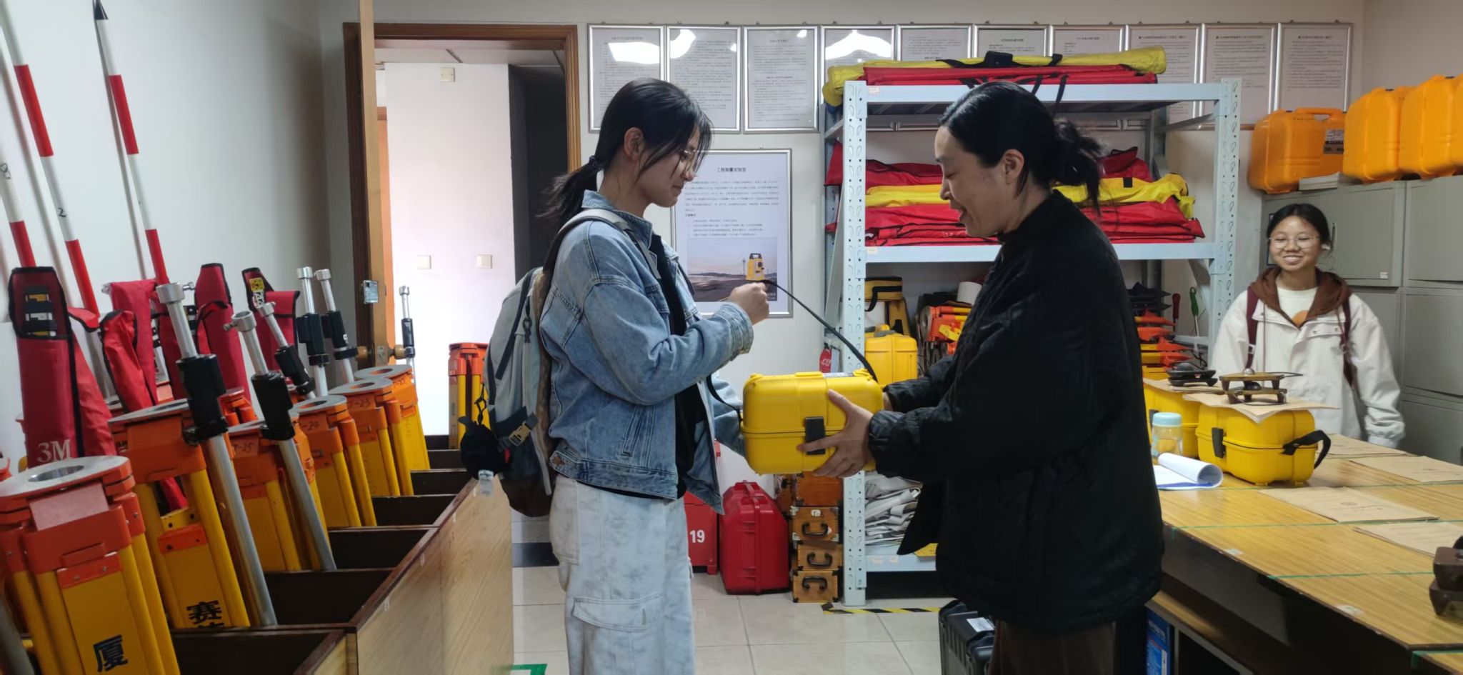 在《测量原理与智能测量》课程的实验教学中,工程师王晓虹在嘉庚五303工程测量实验室结合具体实验任务,为同学们讲解仪器操作流程以及相关安全注意事项。